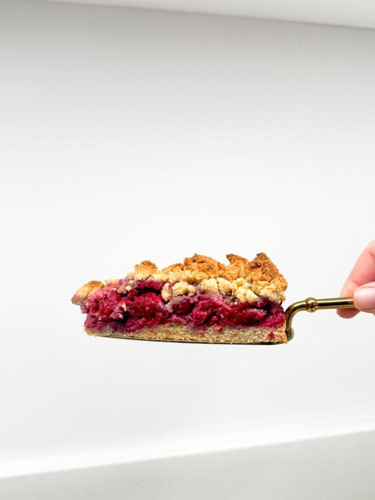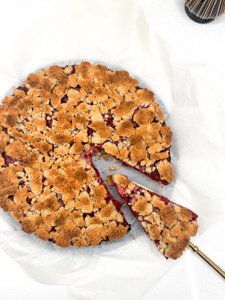 Na wiśnie nakładamy pokruszoną resztę ciasta.