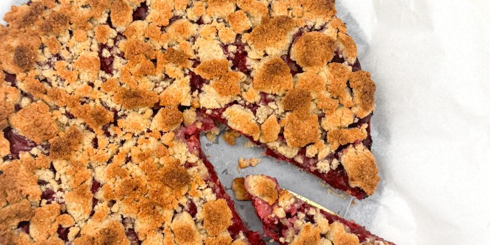 Na wiśnie nakładamy pokruszoną resztę ciasta.